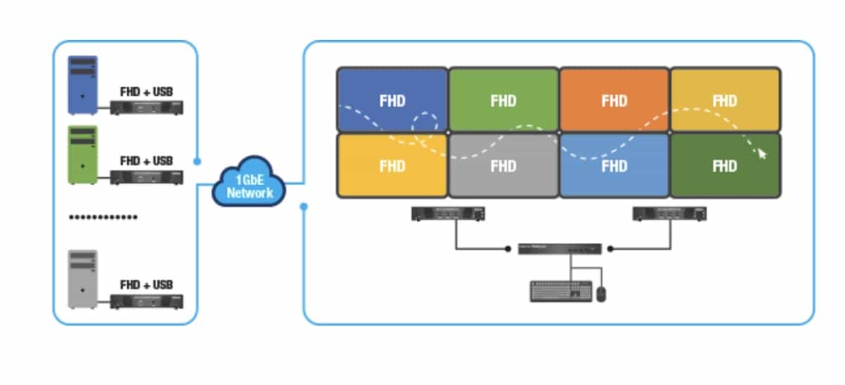 Lavora su un’ampia area di lavoro multi-monitor quando abbinato a Extio 3 IP KVM.